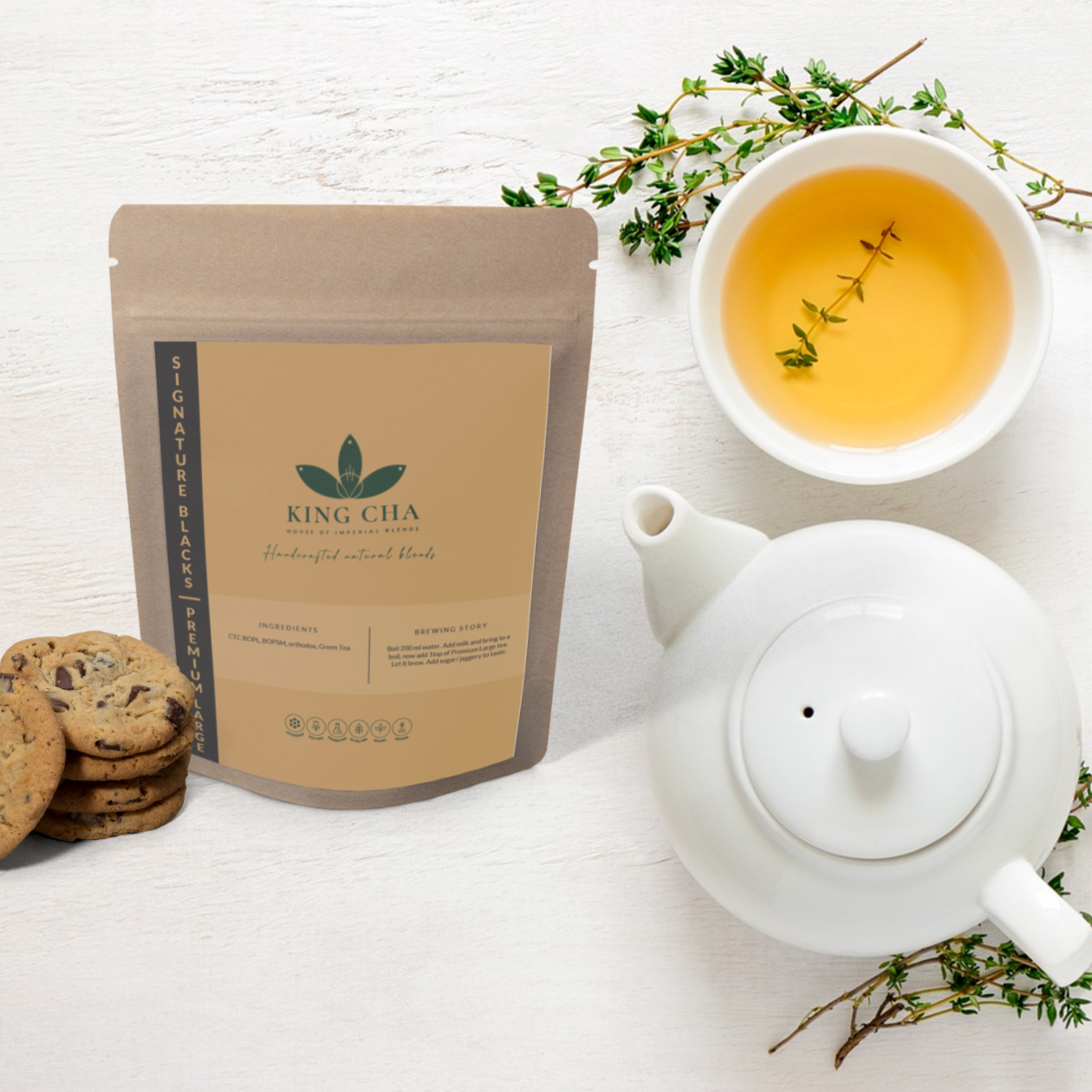 - Brewing Story: For the perfect cup we recommend that you boil 90 ml water in a saucepan, add 1-2 tsp King Cha Premium Large Tea as per how strong the tea should be. Add milk and sugar. Bring it to a boil and sieve in a cup. Enjoy it hot when served. Additional flavours of King Cha Tea Masala or ginger can be added to boiling water to enhance flavours.